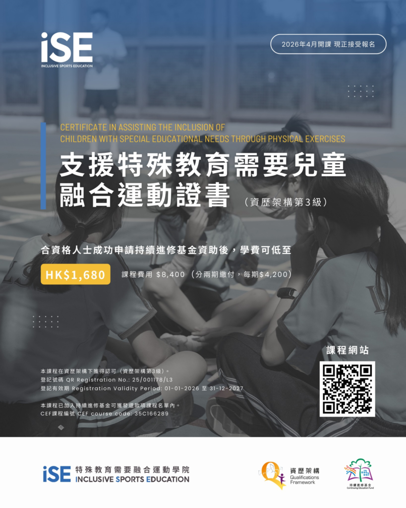 iSE has been established with the aim to provide quality sports education to children with special educational needs. The ultimate goal is to build their confidence, self-esteem and social emotional well-being. And to do that, raising the awareness about the importance of inclusive education among educational practitioners, and the training of professionals and teachers is paramount in the success of making inclusive education a reality in Hong Kong. I am inspired to see iSE’s professionalism and dedication reflected by their persistence in creating quality programs in both areas. This has also motivated me to provide continuous consultation support to their current and future projects. I look forward to seeing them grow stronger and more innovative as an educational organization.