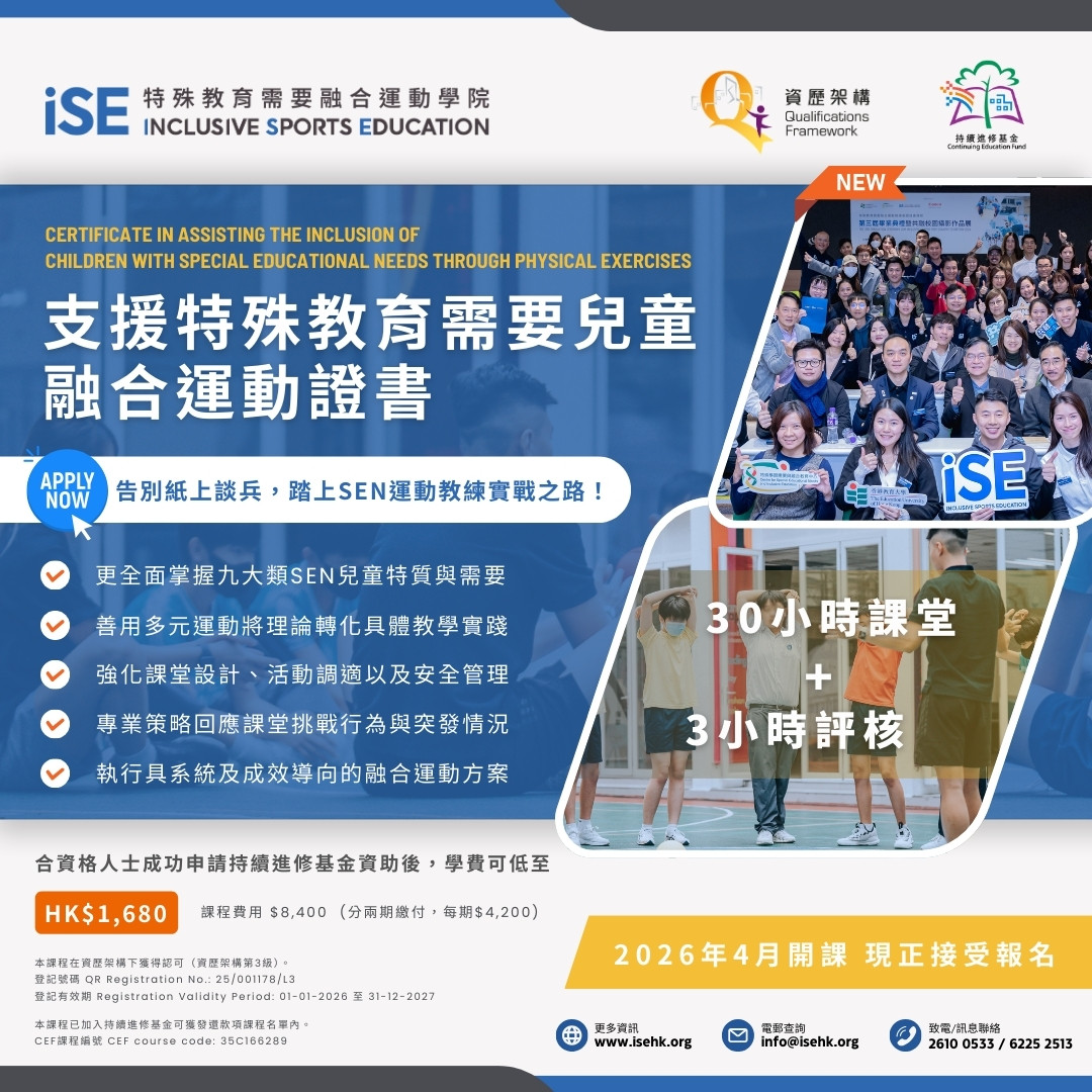 本課程專為體育教練,以及於學校、社福機構及社區單位中從事或計劃從事前線支援工作的人士而設,透過系統化的理論與實務培訓,裝備學員以運動支援特殊教育需要(Special Educational Needs, SEN)兒童在學習、社交及情緒等方面的融合發展。 課程將介紹九大類SEN的主要特質及本地融合教育的政策與實務脈絡,協助學員更精準理解服務對象在運動參與及日常學習中的實際需要。